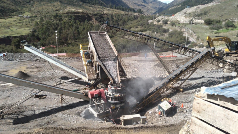 Planta integral de trituración equipada con componentes para trituración primaria, zarandeo y secundaria, diseñada para una alta eficiencia operativa en proyectos de gran envergadura.